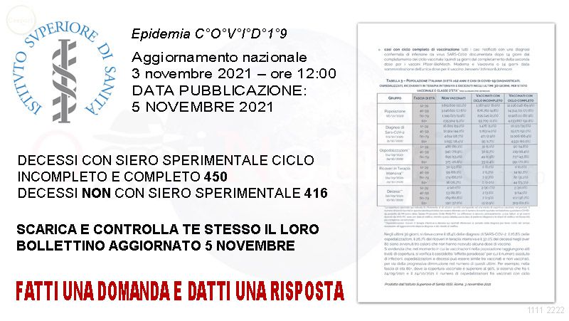 Direttamente dall’Istituto Superiore di Sanità il bollettino del 3 Novembre 2021, secondo cui nei precedenti 30 giorni si sono verificati le seguenti morti covid
