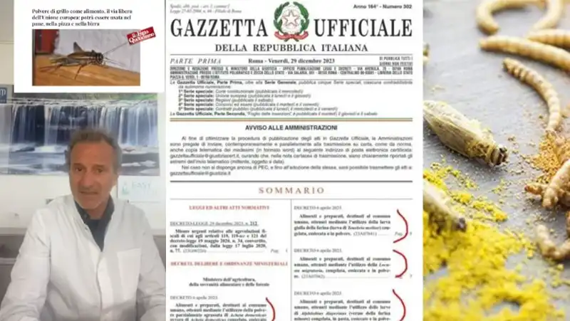 Qui sono apparsi i decreti che regolano la distribuzione di prodotti a base di quattro specie di insetti: le larve del verme della farina minore (Alphitobius diaperinus), le larve gialle della farina (Tenebrio molitor), le locuste migratorie e i grilli domestici (Acheta domesticus). Tutte in forma congelata, essiccata o in polvere. Verranno mescolate, come si legge su Il Giornale d’Italia, a prodotti da forno, pasta, pane, pizza, patatine, barrette, biscotti, cioccolata, birra. Fortunatamente, gli scaffali contenenti la farina di insetti saranno separati dagli altri presenti nei supermercati, o almeno così ha assicurato il ministro dell’Agricoltura, Francesco Lollobrigida. Veniamo, ora, al problema – enorme – che abbiamo solo accennato: sugli effetti nel corso degli anni, in particolare su bambini, donne incinte e soggetti fragili, del consumo della farina di insetti non sappiamo praticamente nulla, come nulla sapevamo (e in molti ignorano tuttora) come agisse la biotecnologia mRNA. “Ci vogliono far regredire fisicamente e mentalmente”, è questo l’allarme lanciato da Patrizio Hermes Barbon, medico chirurgo ed esperto in nutrizione. Nel video che vi mostriamo, il dottor Barbon ha esposto una lunga serie di gravi perplessità, non senza aver premesso come la follia di Bruxelles abbia già investito molti agricoltori, in Olanda e in Italia, costretti a chiudere stalle e campi “perché inquinano troppo”, in nome della tutela della biodiversità. Eppure, il nostro Paese rappresenta l’eccellenza della Dieta mediterranea, che è Patrimonio immateriale dell’Unesco dal 2010, e qualcosa vorrà pur dire.