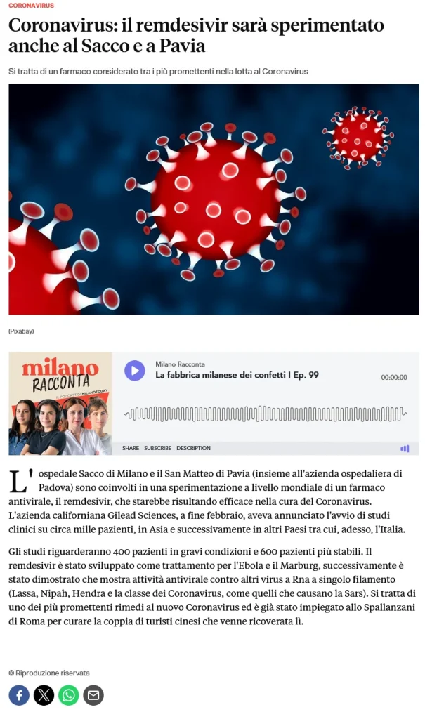 Nei vari mezzi di comunicazione dell’epoca si iniziano a vedere articoli come quello di Milano Today del 12 marzo 2020, nel quale si dà notizia che l’antivirale per l’ebola era già in uso in Italia per i pazienti Covid.