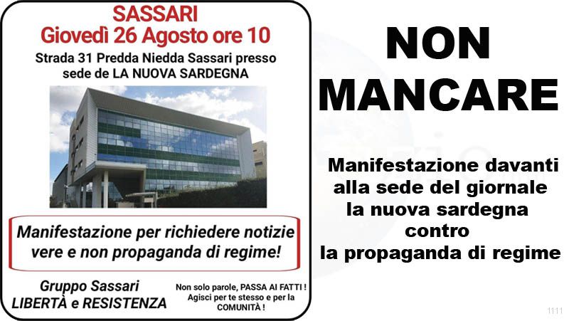 Giovedì 26 agosto ore 10 presso strada 31 Predda Niedda Sassari si terrà una manifestazione davanti alla sede del giornale la nuova sardegna contro la propaganda di regime e la narrazione a senso unico posta in essere dalla quasi totalità dei mezzi di informazione, che, finanziati appositamente da un governo abusivo ed illegittimo, riporta solo notizie allarmanti riguardo la finta pandemia, terrorizzando la popolazione.