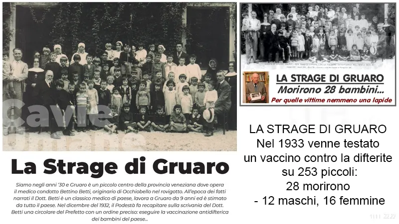 Gasparotto ripercorre pure i giorni seguenti riportando i racconti della madre: «Molti genitori andarono a farsi sentire in municipio muniti di bastoni. Capito l’errore e visto ciò che stava succedendo le autorità salirono a Gruaro per far sparire ogni traccia di quel vaccino. Passarono di famiglia in famiglia per raccattare tutte le scatole vuote». Una storia, quella della strage di Gruaro, confermata pure dalle ricerche di Gianni Strasiotto (studioso di storia locale, per 26 anni sindaco di Pravisdomini in provincia di Pordenone) e Ariego Rizzetto, docente scolastico e storico del Veneto Orientale. Il primo ne fa riferimento in una ricerca sulla storia della diocesi di Concordia, il secondo la cita nella pubblicazione «Gruaro, venti secoli di storia». Nel testo, Strasiotto aggiunge ulteriori dettagli: «Il vaccino venne somministrato ai bimbi dai tredici mesi agli otto anni, il costo per dose era di 80 centesimi, ma gratuita per le famiglie non abbienti. I parroci di Gruaro e della frazione di Bagnara vennero invitati a illustrare la bontà del vaccino alla popolazione: si verificarono 28 decessi a causa di paralisi, molti altri bimbi restarono segnati per tutta la vita».
