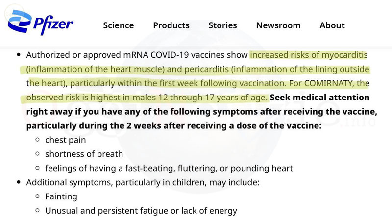 “I vaccini mRNA COVID-19 autorizzati o approvati mostrano un aumento del rischio di miocardite (infiammazione del muscolo cardiaco) e pericardite (infiammazione del rivestimento esterno del cuore), in particolare entro la prima settimana successiva alla vaccinazione. Per COMIRNATY, il rischio osservato è più elevato nei maschi di età compresa tra 12 e 17 anni.”