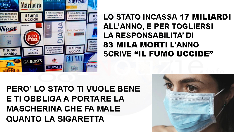 Se ci soffermassimo a pensare invece di bere tutto quello che ci propone la TV, potremmo arrivare a capire che la mascherina è solo ed esclusivamente un segno di sottomissione da parte di criminali che siedono sulle poltrone del nostro Stato, è un bavaglio che serve a dividere le persone, a non vedere più le espressioni del viso, serve a renderci schiavi di questo sistema che ci vuole dei perfetti ebeti a comando dell’Elite. Ma le persone più scaltre invece si informano, studiano, ricercano. La salute è un bene prezioso, non dimentichiamolo, non ricordiamoci che esiste solo quando l’abbiamo persa. Le case farmaceutiche vivono dai malati, non dai sani, un malato cronico è un cliente a vita delle case farmaceutiche. Se veramente tenessero alla tua salute, non venderebbero sigarette, non gonfierebbero gli alimenti con veleni solo per il profitto e non inquinerebbero la nostra aria, per vendere petrolio.