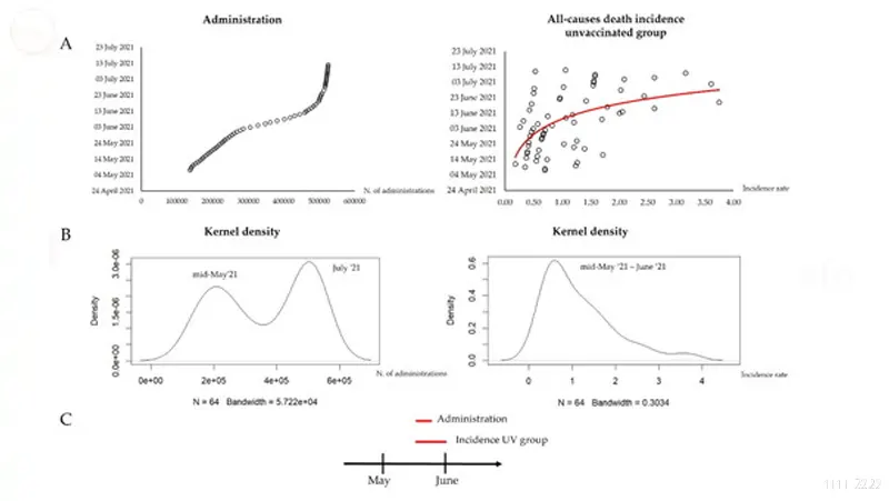 Per lo studio sono state selezionate 3 fasce d’età: 50-59 anni, 60-69 anni e 70-79 anni, per ognuna di queste è stato fatto il test U di Mann-Whitney, un test non parametrico, per verificare la presenza di una differenza significativa nella mortalità per tutte le cause tra vaccinati e non vaccinati. Dopo aver rilevato le differenze nei tassi di mortalità, è stato costruito un modello di regressione lineare che assumendo la somministrazione dei vaccini come variabile indipendente, stimasse l’incidenza di mortalità nei non vaccinati. Il test non parametrico ha rilevato in tutti e 3 i gruppi un eccesso di mortalità nei “non vaccinati” e le regressioni lineari hanno trovato che l’andamento nella somministrazione delle dosi era in grado di prevedere il numero di morti nei “non vaccinati”: