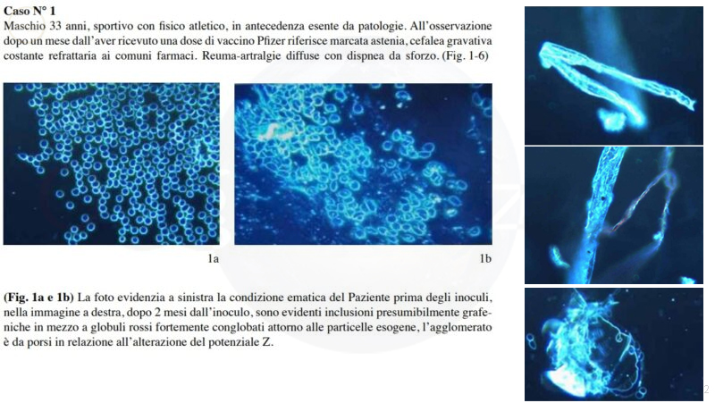 G: “Dei 1.006 soggetti analizzati, 948 – il 94% del totale – evidenziavano, dopo inoculo di vaccini a mRna a distanza di un mese o più, varie alterazioni dello stato di aggregazione dei globuli rossi e la presenza nel sangue periferico di particelle di varia forma e dimensione di dubbia natura. In 12 soggetti, per motivi diversi, erano state eseguite analisi del sangue con stessa metodica prima della vaccinazione. Avevano quadri ematologici normali. Le alterazioni trovate dopo somministrazione di vaccini a mRna rafforzano il sospetto che le modifiche sarebbero da riferirsi in prima battuta ai sieri stessi. Soltanto nel 6% di questi casi sintomatici dopo gli inoculi abbiamo riscontrato un quadro di normalità”.