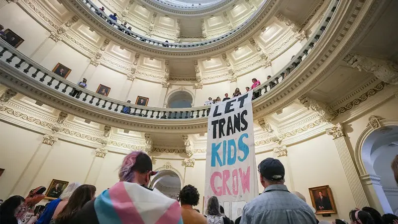 Manifestanti contro il divieto di cure mediche per l’affermazione di genere nella rotonda del Campidoglio del Texas ad Austin, lo scorso scorso. Credito: Mikala Compton/Austin American-Statesman, via Associated Press