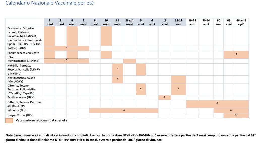 Punto cardine del nuovo Pnpv è il Calendario vaccinale, oltre a presentare l’offerta vaccinale attivamente e gratuitamente prevista per fascia d’età, contiene le vaccinazioni raccomandate a particolari categorie a rischio (per condizione medica, per esposizione professionale, per eventi occasionali, per vulnerabilità sociali ed economiche)”.